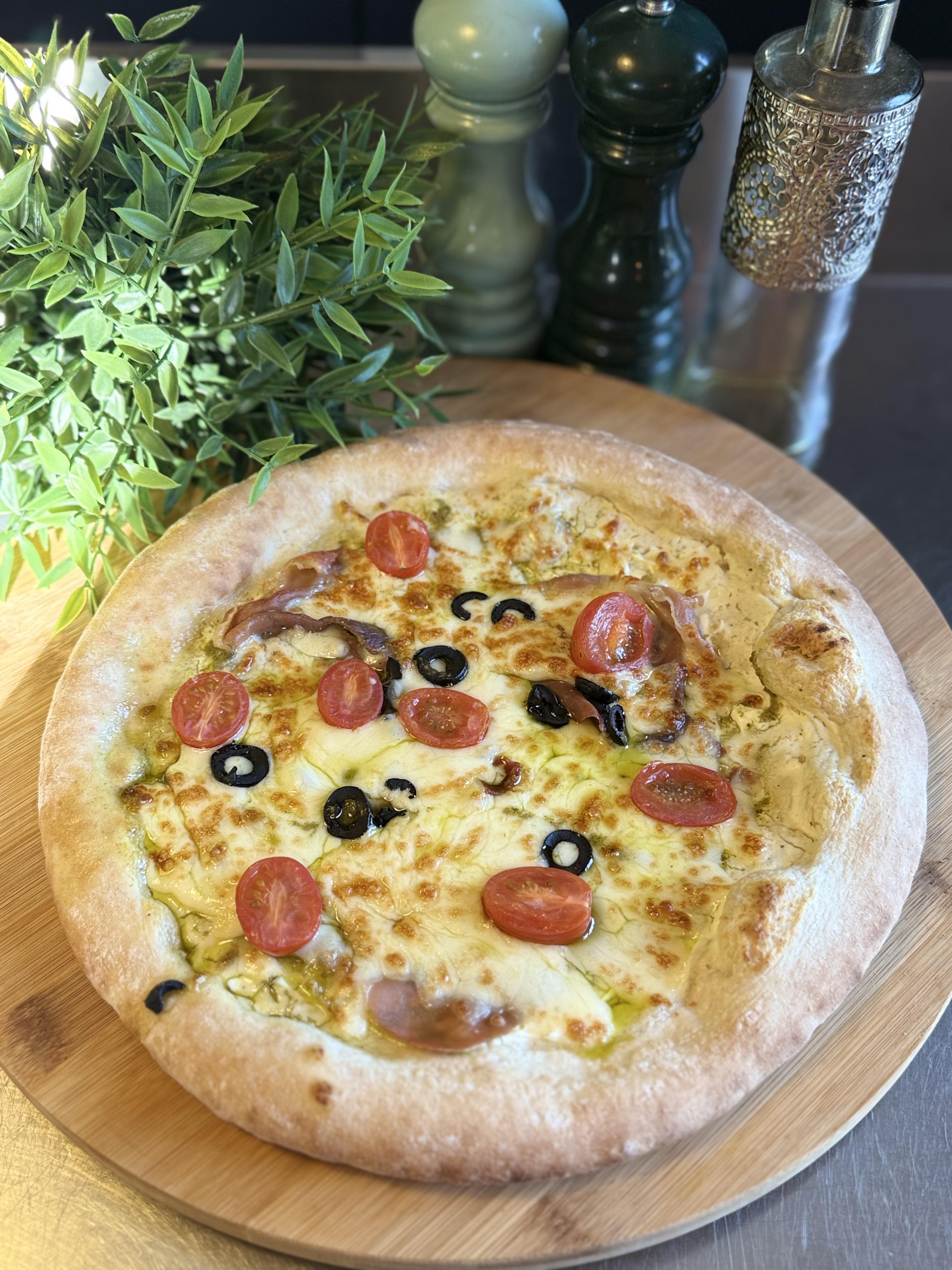 Recouverte de mozzarella fondante, de jambon sec italien, de tomates cerises rôties et d’émincés d’olives noires…