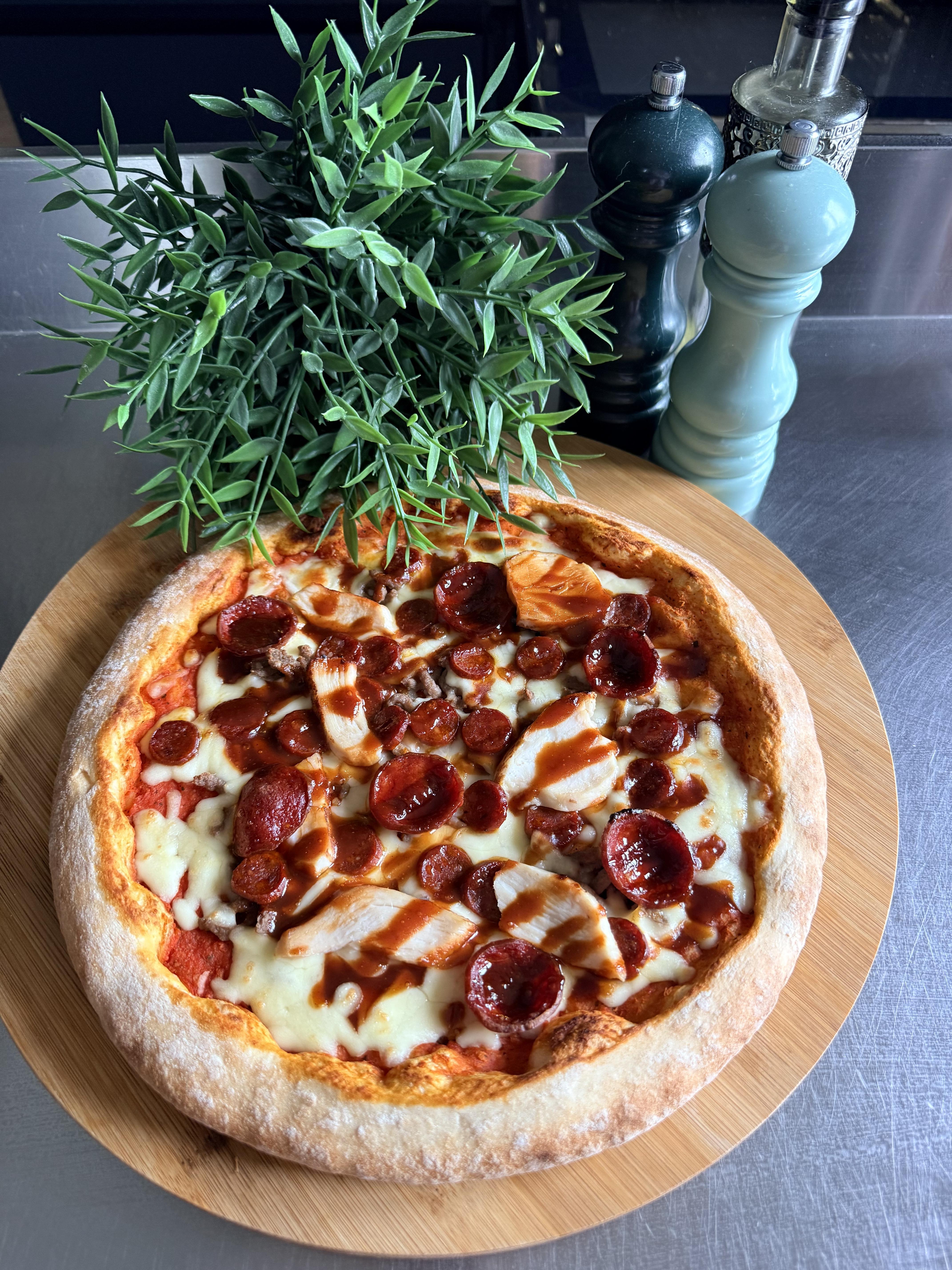 Sur une base de sauce tomate et mozzarella fondante, découvrez un mélange savoureux de bœuf haché, poulet, merguez et chorizo, le tout relevé par une touche de sauce barbecue pour une explosion de saveurs.